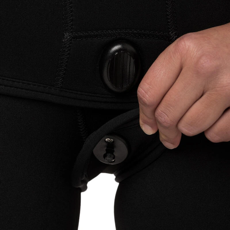 La fermeture de cette veste d’apnée est de type sous-cutale avec oeillets de fixation rapide. (queue de castor avec grenouille à clip).